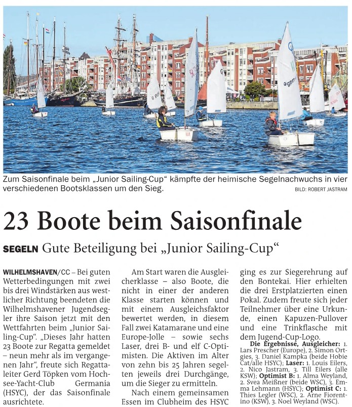 Am 29. September 2024 wurde mit dem Wilhelmshaven Junior Sailing-Cup die letzte Jugendregatta für Wilhelmshaven Friesland gestartet.